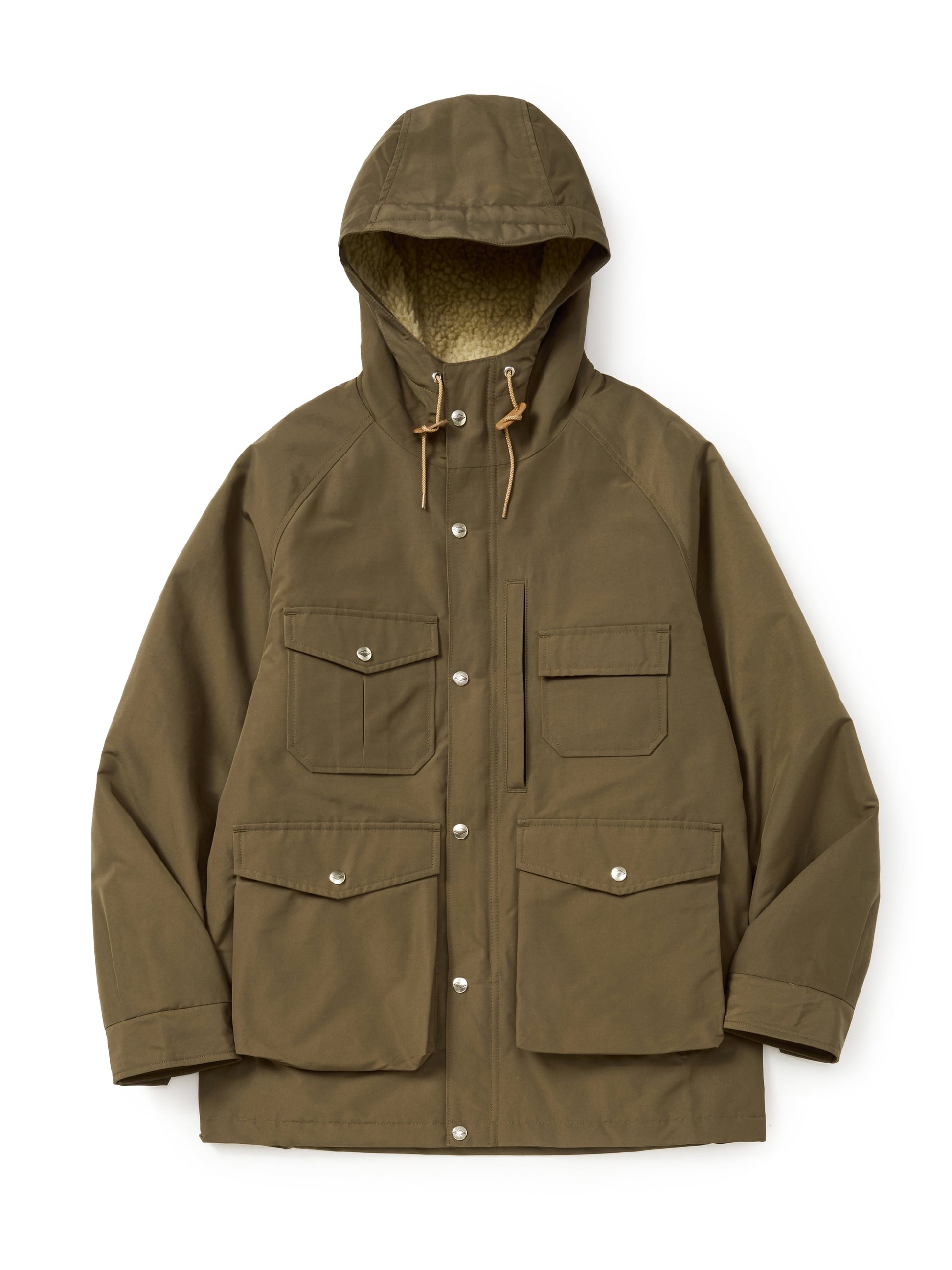 日本で織られた60/40クロス(コットン60%/ナイロン40%)を使用。化学的なコーティングに頼らず、糸の構造そのもので防風・撥水性を発揮します。しっかりとした質感ながら軽く、抜群の保温性を誇ります。