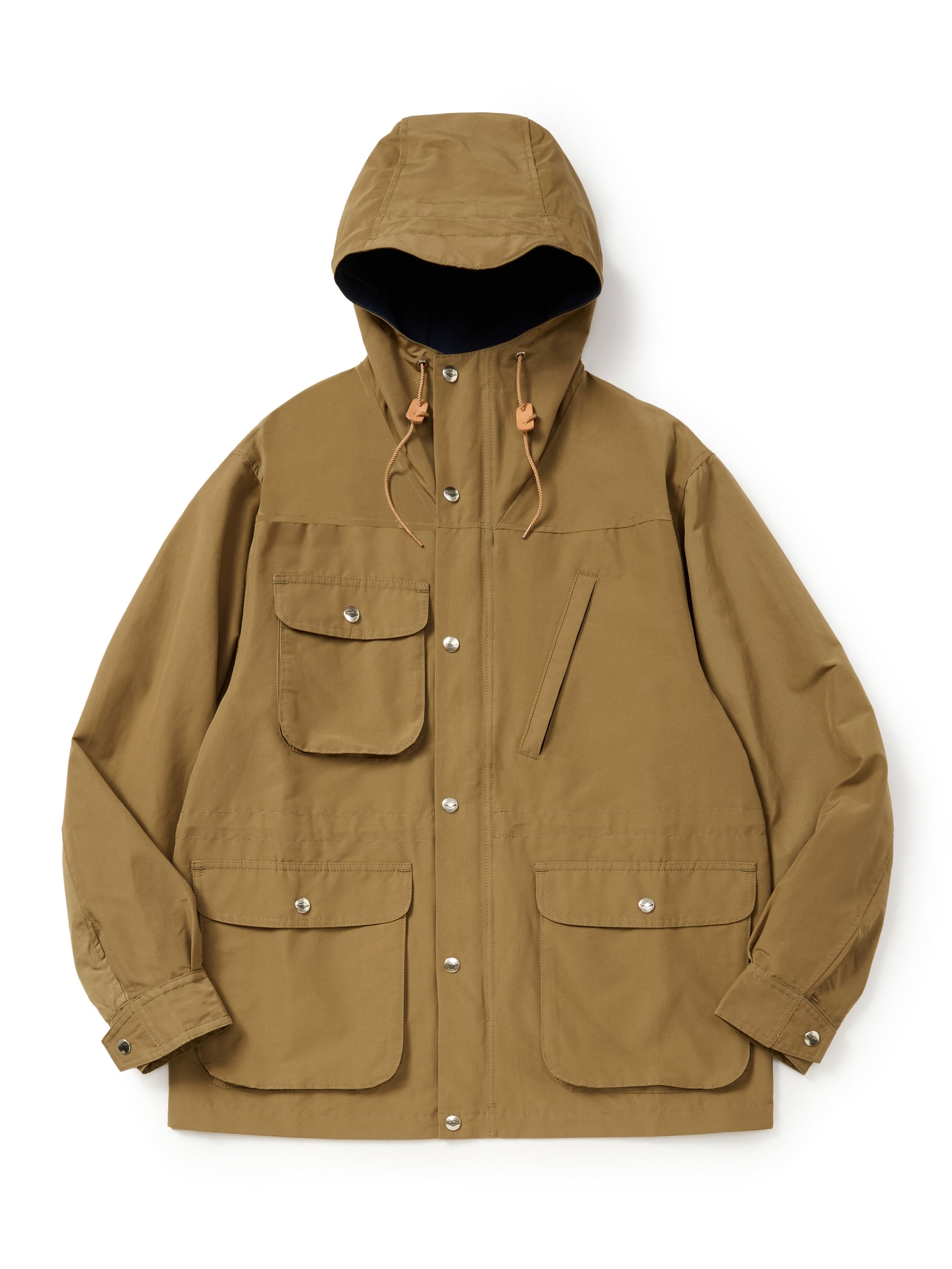 - フード:3枚構造で頭にフィット、ツバ付きで雨除け効果、エイジングを楽しめるレザーストッパー付きドローコード